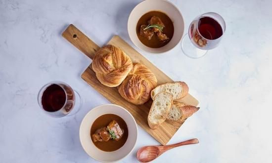 百膳の夢名物のじっくり煮込んだやわらかい牛肉のビーフシチューと濃厚な車海老の贅沢なスープのセット。ご自宅で豪華なディナーをお楽しみください
